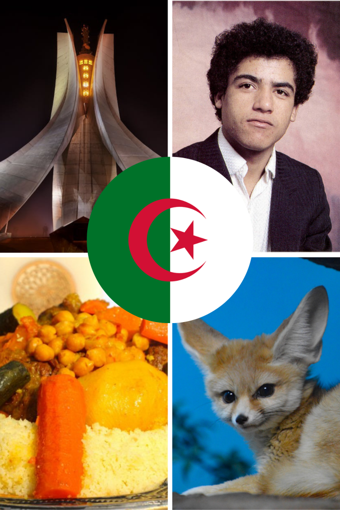 Le pays des fennecs, capitale Alger, est un État africain limité au nord-est par la Tunisie, à l’est par la Libye, au sud par le Niger et le Mali, au sud-ouest par la Mauritanie et le territoire du Sahara occidental, et à l’ouest par le Maroc. On dénombre 46.700.000 d’habitants sur le territoire. Leurs origines sont multiples. Ils sont Arabes, Kabyles, Amazighs ou Berbères , Chaouias,